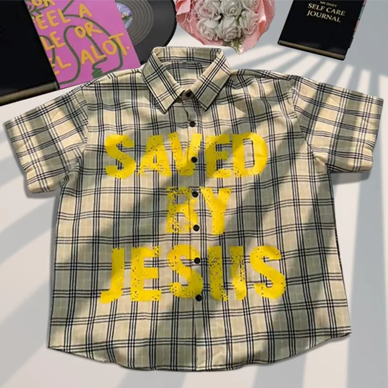 The Plaid Statement Button-Up Shirt takes the classic flannel silhouette and charges it with bold graphic energy. Featuring powerful messages like “SAVED BY JESUS,” “GRITZ,” and all-seeing eye artwork, these short-sleeve shirts blend faith, fashion, and street culture into one fearless piece.